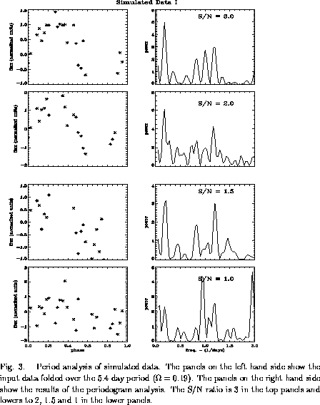 In reality, it is hard to imagine a spot modulation being perfectly sinusoidal. If a star has a single spot, or spotted region, on its surface the observed variation will be constant (bright) for the time that the spot is on the far side. A slow fall (rise) will be observed as the spot rotates into (out of) view. The flux will be nearly constant (dim) in between since the projected area of the spot does not change. Further, there is no reason to expect that any given star will have only one spot. In fact, Doppler imaging of active stars usually indicates more than one spotted region, and none of the spotted regions are round (cf. Strassmeier et al. 1994). To simulate this more realistic case, the above model was modified so that the input signal was the sum of three sine waves. The sine waves are assigned random strength. The phases are assigned with a random fluctuation with a standard deviation of one about phase 0 so that two spots do not cancel each other. Of course in the real universe, two spots may cancel each other so this simulation still overestimates the ability of the periodogram to detect periods. Also, input signals are still initially sine waves and other possibilities such as differential rotation have not been explored. With these caveats in mind, the results are shown in Figures 5 and Figure 6. Not surprisingly, the results are far more complicated than the single spot case. The power peaks can develop side lobes and the bifurcation of a family of solutions into two or more is common, even at high S/N. In general, higher S/N is required to detect any given period and the FAP is higher.