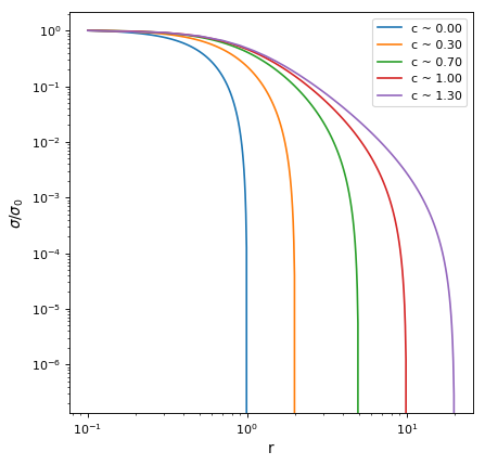 import numpy as np from astropy.modeling.models import KingProjectedAnalytic1D import matplotlib.pyplot as plt plt.figure() rt_list = [1, 2, 5, 10, 20] for rt in rt_list: r = np.linspace(0.1, rt, 100) mod = KingProjectedAnalytic1D(amplitude = 1, r_core = 1., r_tide = rt) sig = mod(r) plt.loglog(r, sig/sig[0], label='c ~ {:0.2f}'.format(mod.concentration)) plt.xlabel("r") plt.ylabel(r"$\sigma/\sigma_0$") plt.legend() plt.show()