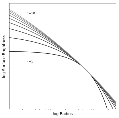 import numpy as np from astropy.modeling.models import Sersic1D import matplotlib.pyplot as plt plt.figure() plt.subplot(111, xscale='log', yscale='log') s1 = Sersic1D(amplitude=1, r_eff=5) r=np.arange(0, 100, .01) for n in range(1, 10): s1.n = n plt.plot(r, s1(r), color=str(float(n) / 15)) plt.axis([1e-1, 30, 1e-2, 1e3]) plt.xlabel('log Radius') plt.ylabel('log Surface Brightness') plt.text(.25, 1.5, 'n=1') plt.text(.25, 300, 'n=10') plt.xticks([]) plt.yticks([]) plt.show()