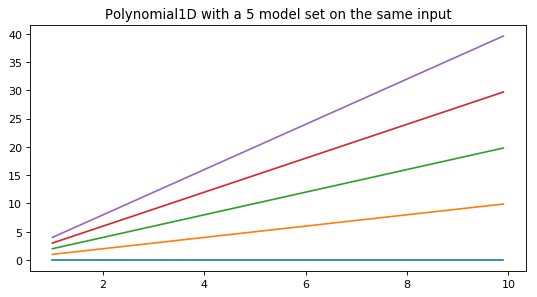 >>> p1 = Polynomial1D(degree=1, n_models=5) >>> p1.c1 = [0, 1, 2, 3, 4] >>> print(p1) Model: Polynomial1D Inputs: ('x',) Outputs: ('y',) Model set size: 5 Degree: 1 Parameters: c0 c1 --- --- 0.0 0.0 0.0 1.0 0.0 2.0 0.0 3.0 0.0 4.0 >>> y = p1(x, model_set_axis=False)