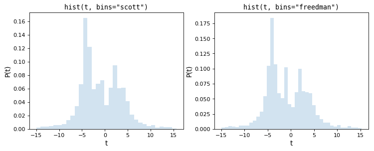 As we can see, both of these rules of thumb choose an intermediate number of bins which provide a good trade-off between data representation and noise suppression.