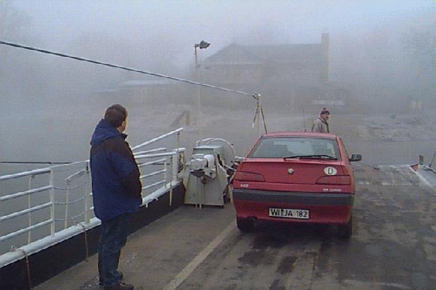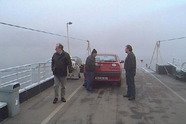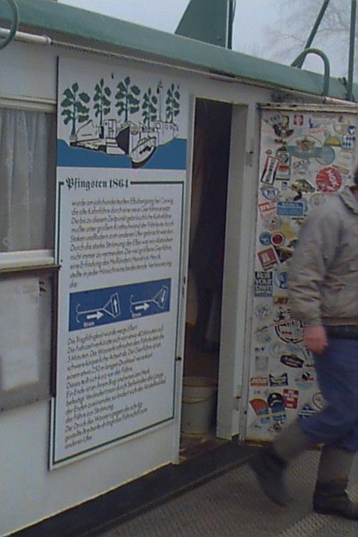 Coswig, Germany. While driving south from Berlin, we followed the back roads as usual. This particular road became very small, was made of cobblestone, wide enough for 1 1/2 cars and was stopped by the Anhalt river just south of Coswig. As we approached the river, we thought we had taken a wrong turn but when a gentleman came out of the house boardering the river and approached the car, I decided to ask directions. He motioned me towards the river, at which point I noticed a small ferry and told me (in German ... he spoke no english) that it would be DM5.00 to cross the river with the car and three passengers. Fair enough, we gave it a go.